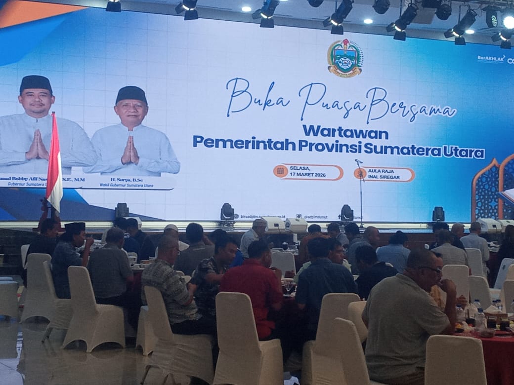 MEDAN, PILAR MERDEKA – Buka puasa Gubernur Sumatera (Gubsu) Bobby Nasution bersama wartawan berlangsung hangat dan penuh kebersamaan di Aula H. Raja Inal Siregar, Kantor Gubernur Sumatera Utara, Jalan Pangeran Diponegoro, Kota Medan, Selasa (17/3/2026).