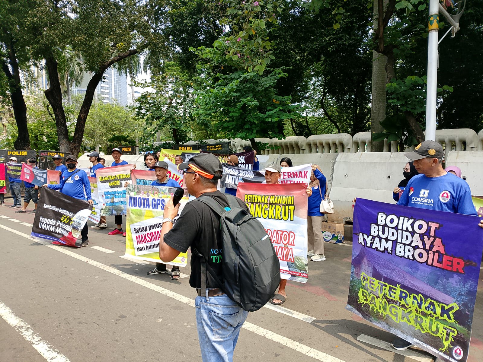JAKARTA, PILAR MERDEKA — Puluhan peternak ayam yang tergabung dalam Komunitas Peternak Unggas Nasional (KPUN) menggelar aksi unjuk rasa di kawasan Monas, Jakarta Pusat, Kamis (9/10). Mereka menuntut perhatian serius pemerintah terhadap kesejahteraan peternak ayam potong, terutama terkait tingginya harga pakan dan minimnya perlindungan bagi peternak rakyat.
