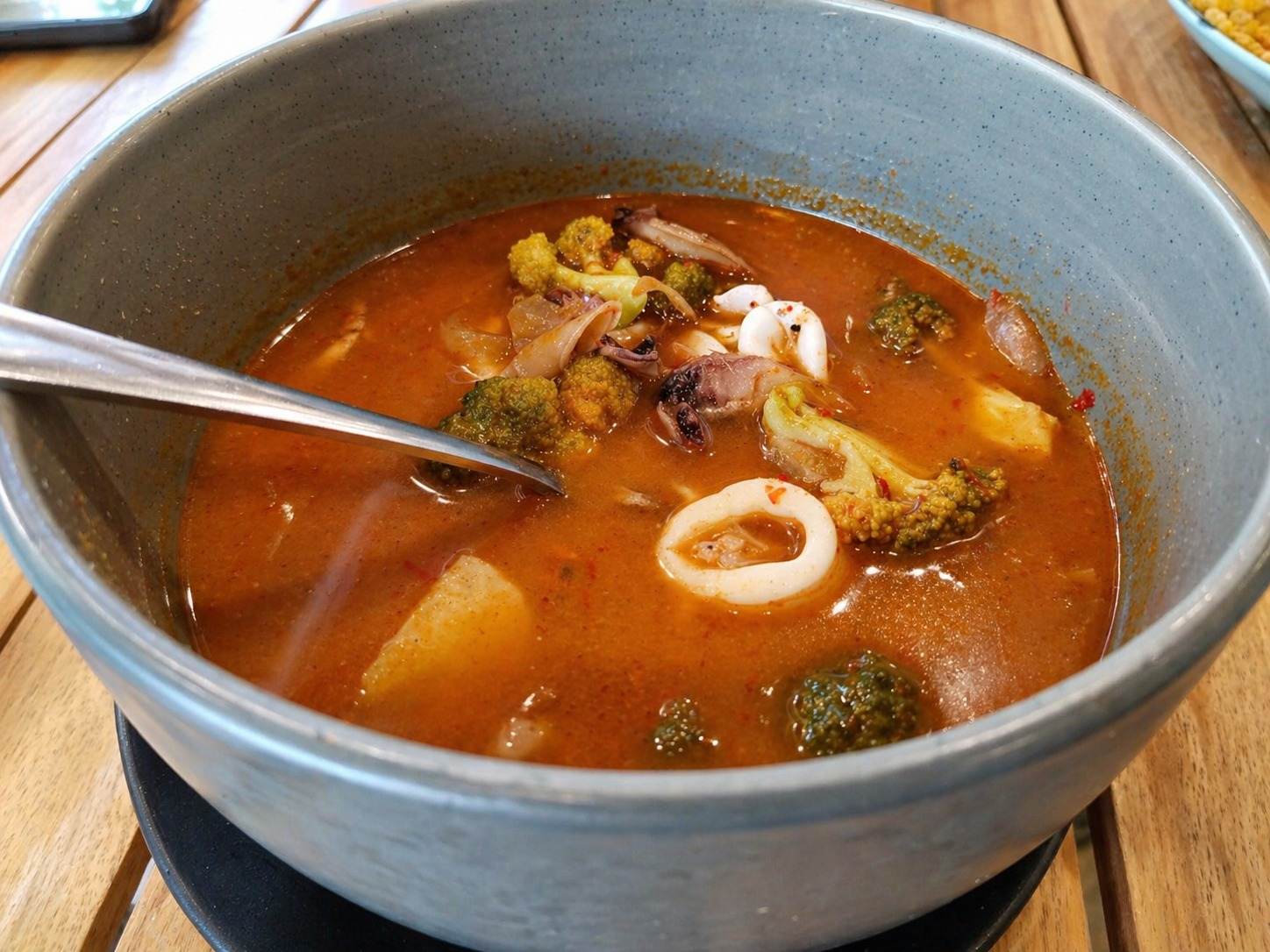 Sop tomyam berisi potongan cumi, udang, bakso ikan, brokoli, jamur, dan bawang bombay. Penjelasan itu membuat pasangan tersebut semakin antusias mencicipi.
