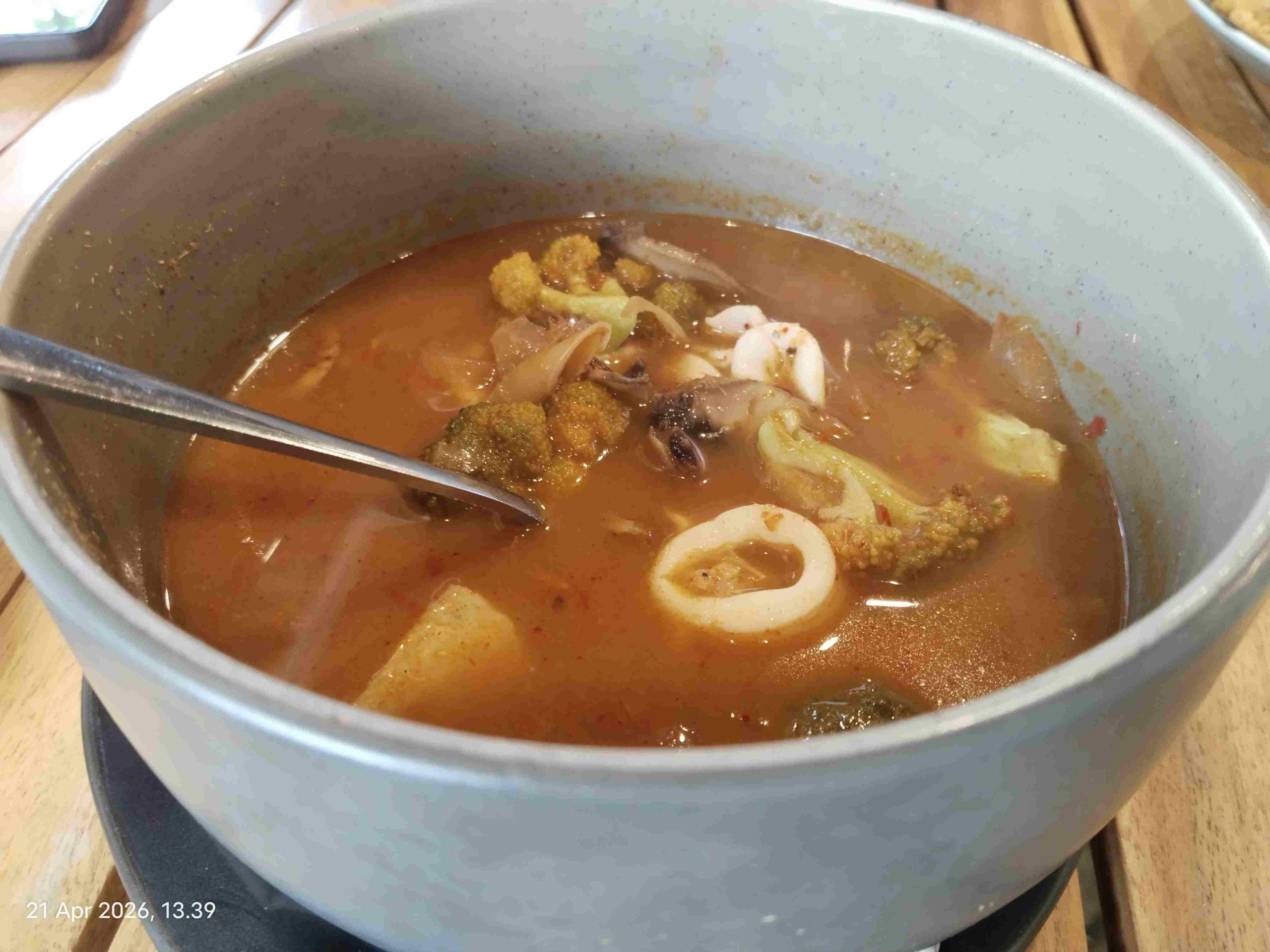 Tak lama kemudian, pesanan datang diantar pelayan bernama Putri. Aroma segar soup tomyam langsung terasa begitu disajikan. Dengan ramah, Putri menjelaskan isi hidangan tersebut ketika ditanya.