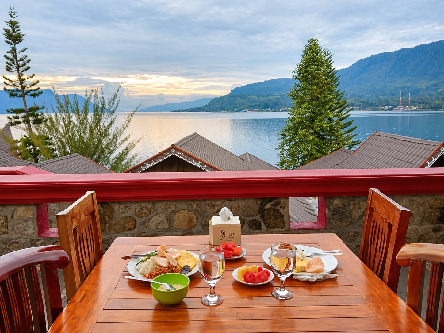 Momen paling membekas terjadi saat sarapan pagi. Di bawah langit cerah. Nina dan suaminya memilih duduk di area outdoor dengan pemandangan langsung ke Danau Toba.