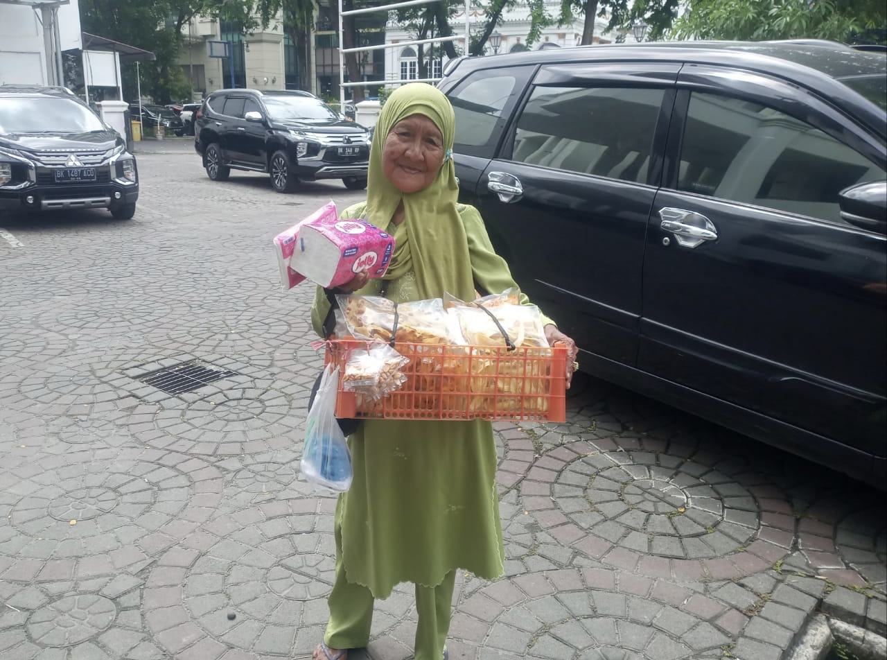 MEDAN, PILAR MERDEKA – Usia opung Halimah tak muda lagi. Umur opung Halimah sudah mencapai 79 tahun. Kendati demikian, opung Halimah masih setia dan gesit menekuni profesinya sebagai penjual keripik ubi sambal, keripik pisang, keripik peyek, kacang tojin perbungkus dan kertas tisu.