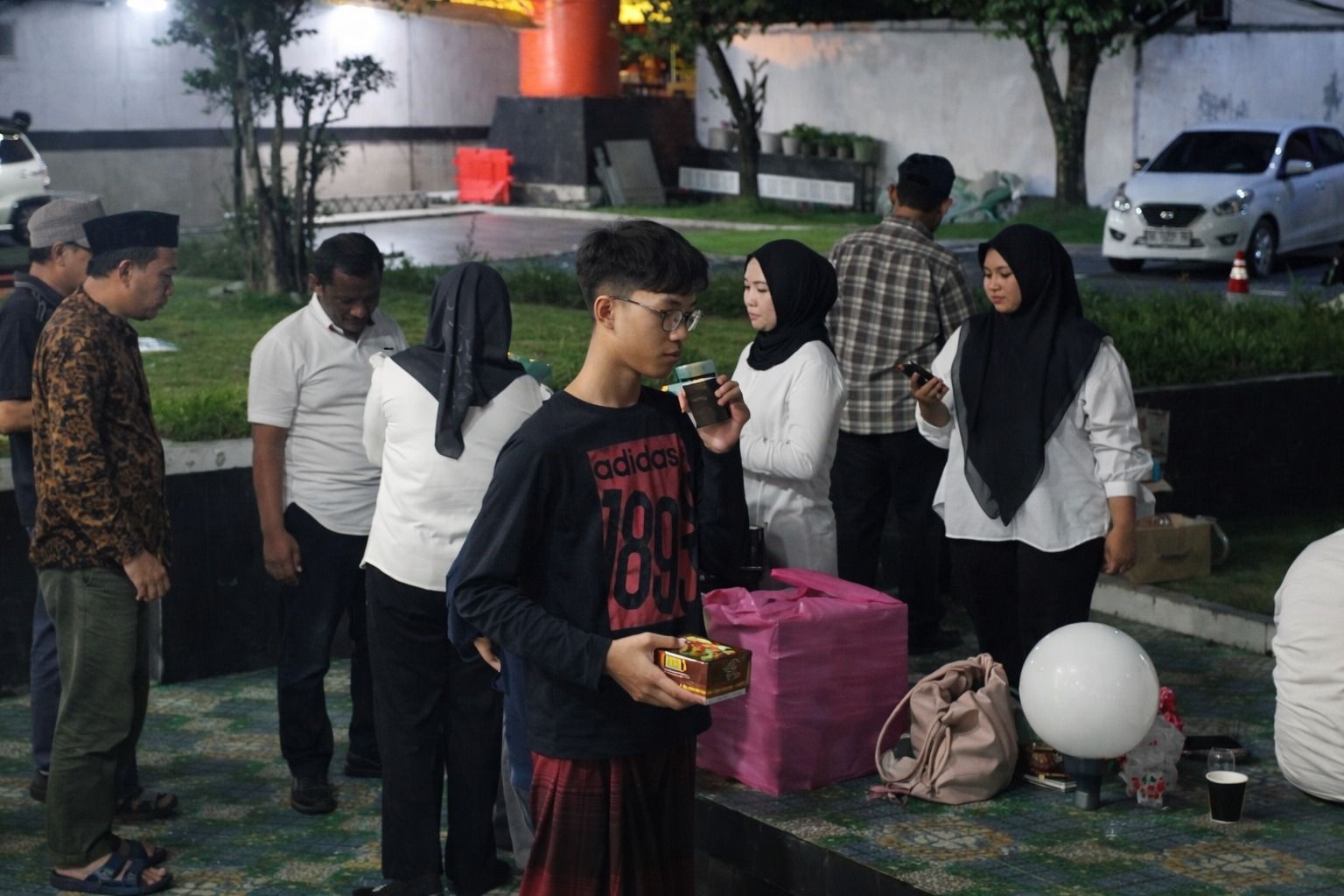Tidak hanya minuman, petugas juga membagikan makanan ringan berupa kue dan roti. Sajian itu dinikmati bersama di halaman masjid. Kebersamaan sederhana ini menciptakan suasana akrab dan penuh rasa syukur.