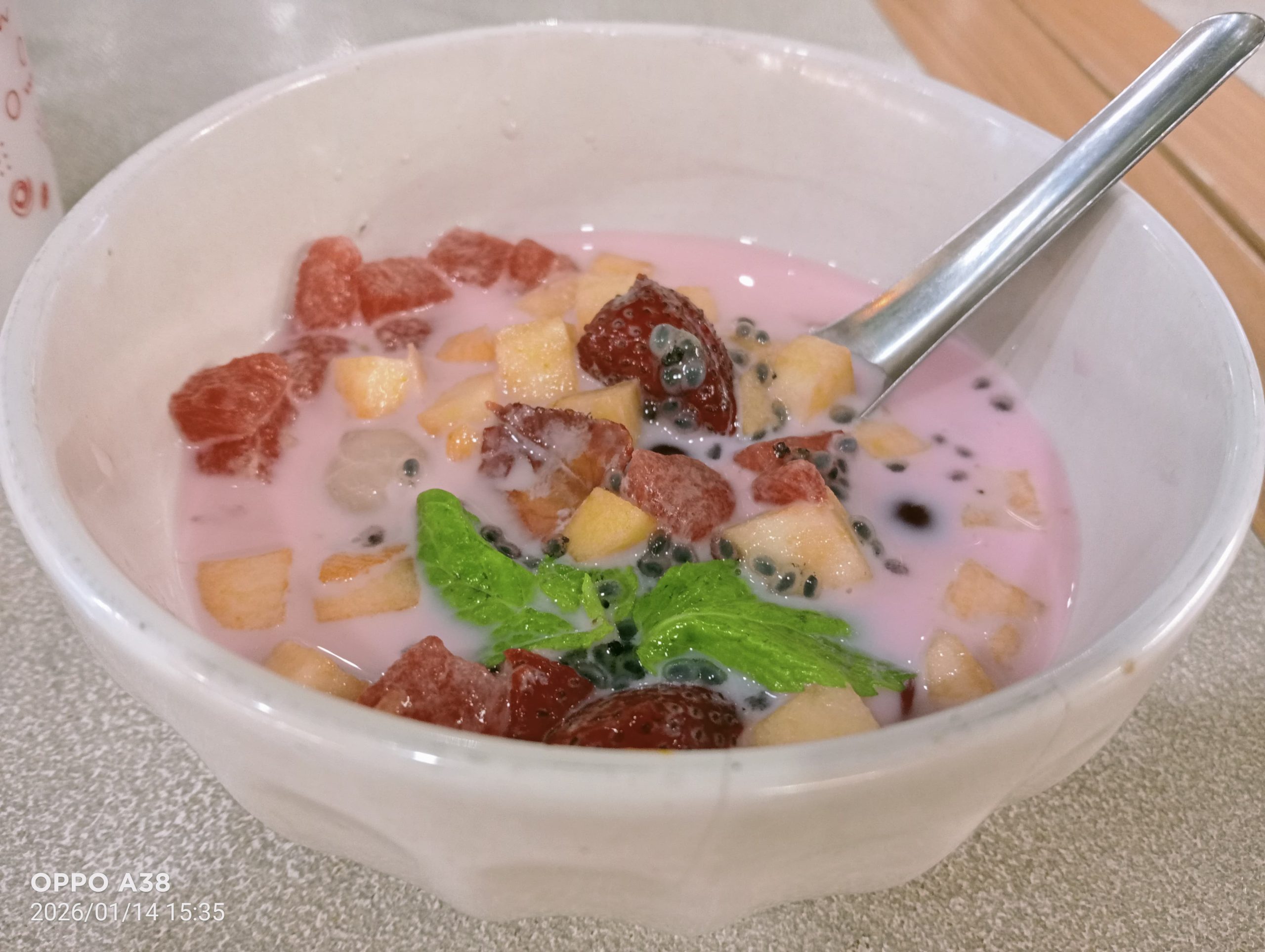 Sop buah Cobek disajikan dalam mangkuk putih sederhana, lengkap dengan sendok dan segelas es serut terpisah. Potongan buah segar yang disebut waitters tampak jelas di permukaan. Nina melihat detail kecil yang membuatnya tersenyum, seperti daun mint, kuah susu bercampur sirup, serta taburan selasih.